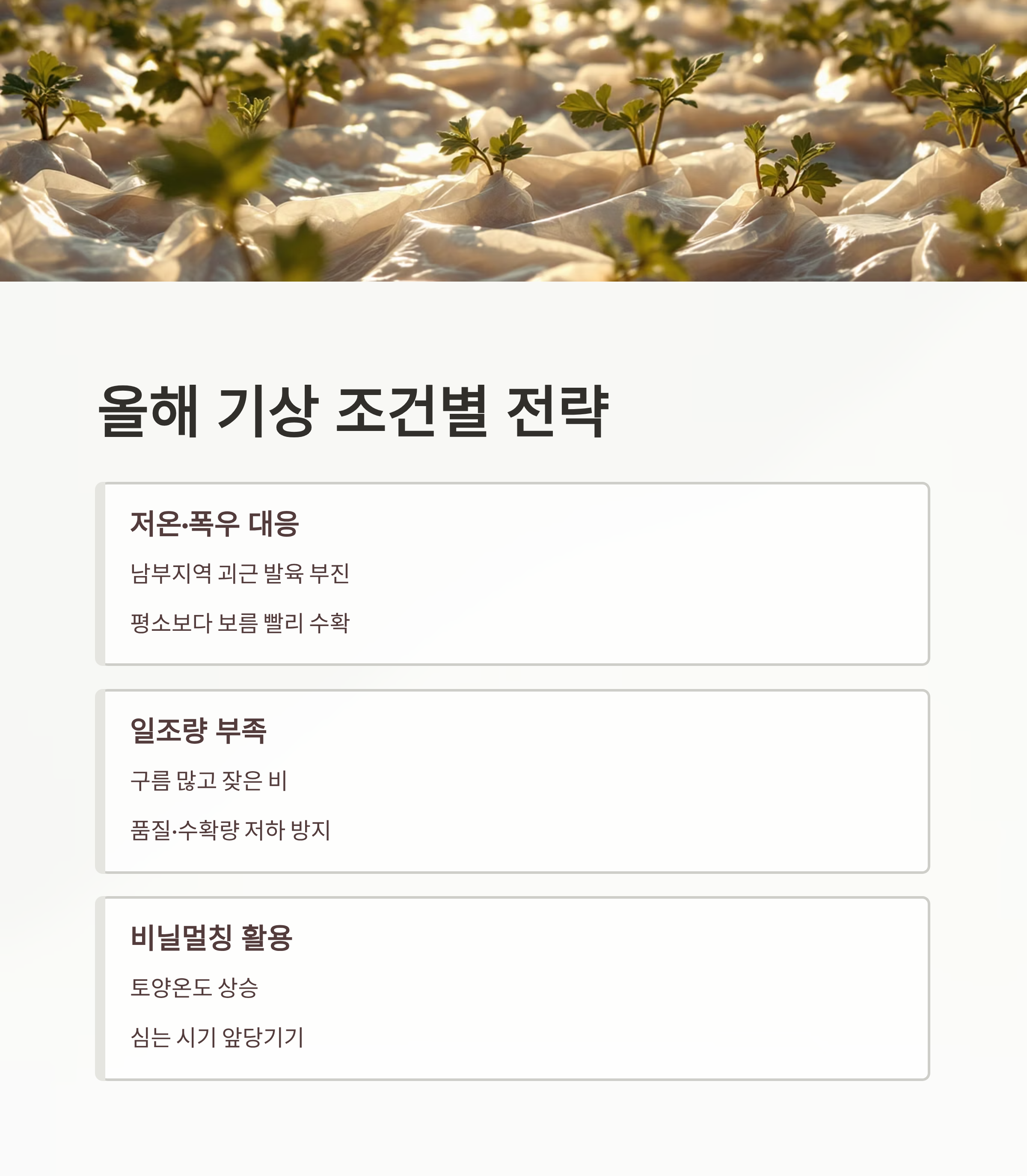 또 비닐멀칭을 활용한 보온재배로 토양 온도를 높이고 심는 시기를 앞당기면, 저온 피해 없이 수확시기 유연성을 만들 수 있습니다.