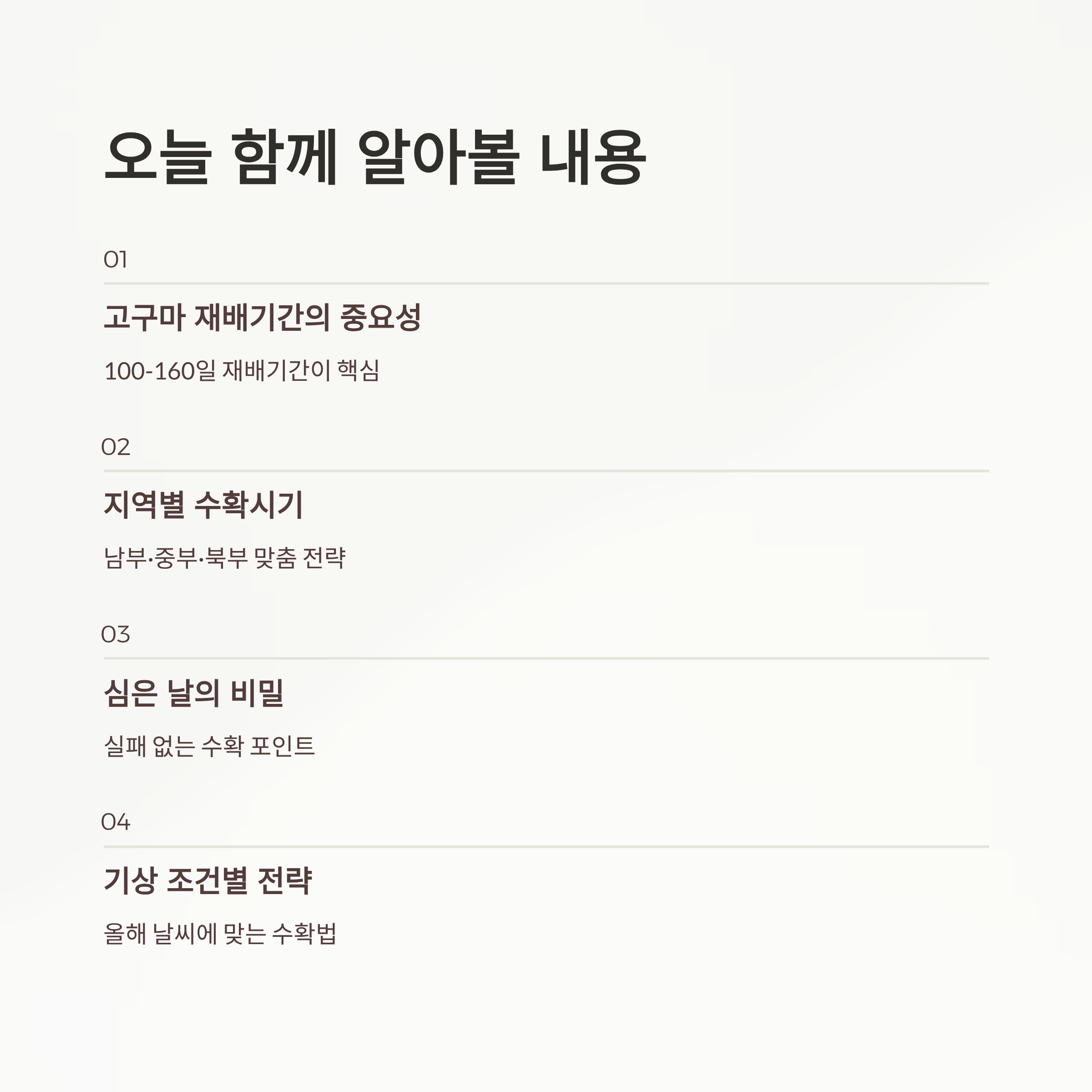 고구마는 심는 시기와 재배기간, 그리고 그해의 날씨 변동에 따라 수확의 질과 양이 크게 달라집니다. 서리에 민감하고 일조가 충분해야 땅속에서 괴근이 제대로 자랍니다. 고구마 심은 날, 재배 기간, 기상 조건만 확실히 체크한다면, 누구나 실패 없는 풍작을 경험할 수 있어요.