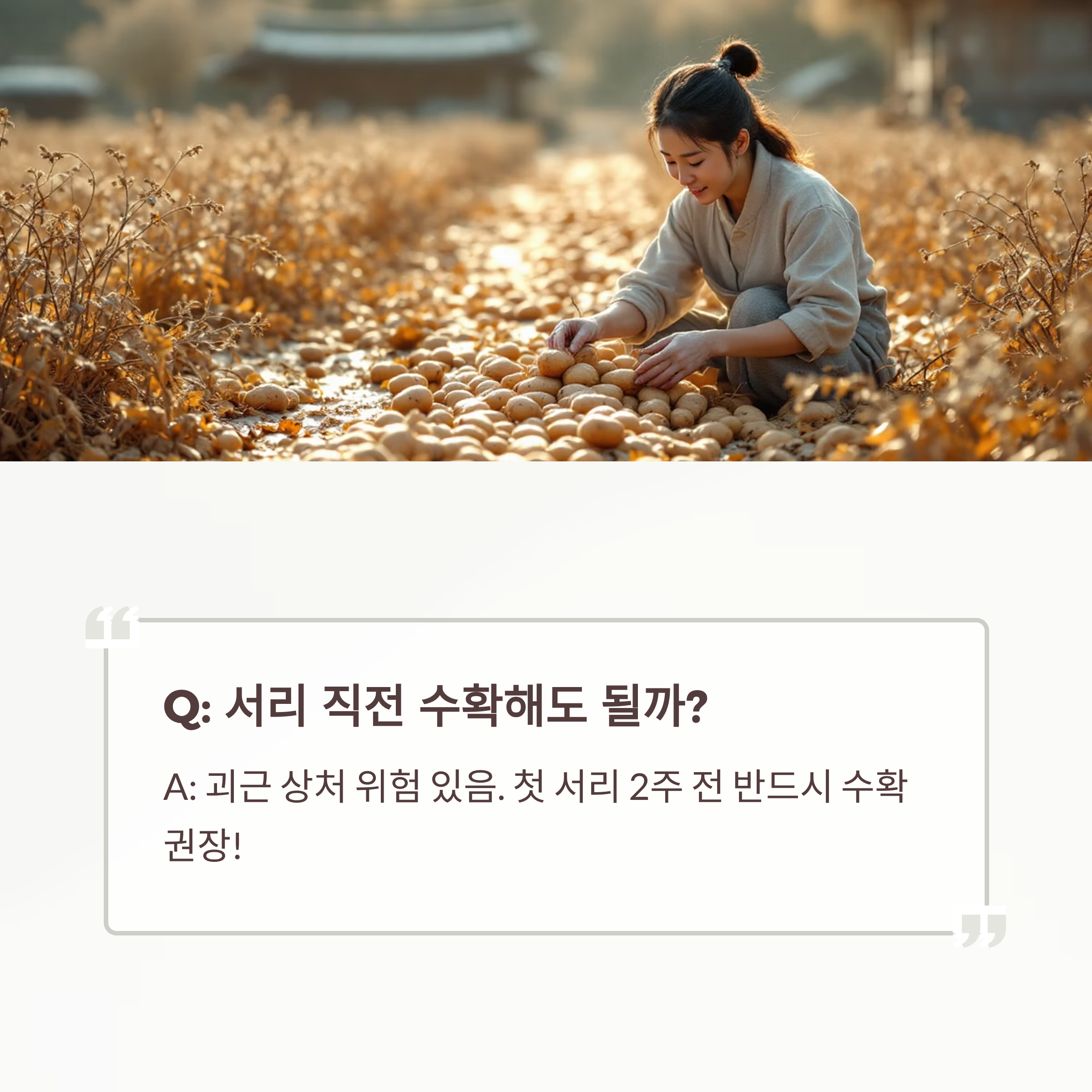 A: 서리 내리기 직전에는 괴근에 상처가 생길 위험이 있어요. 적어도 첫 서리 2주 전엔 반드시 수확을 권장합니다.