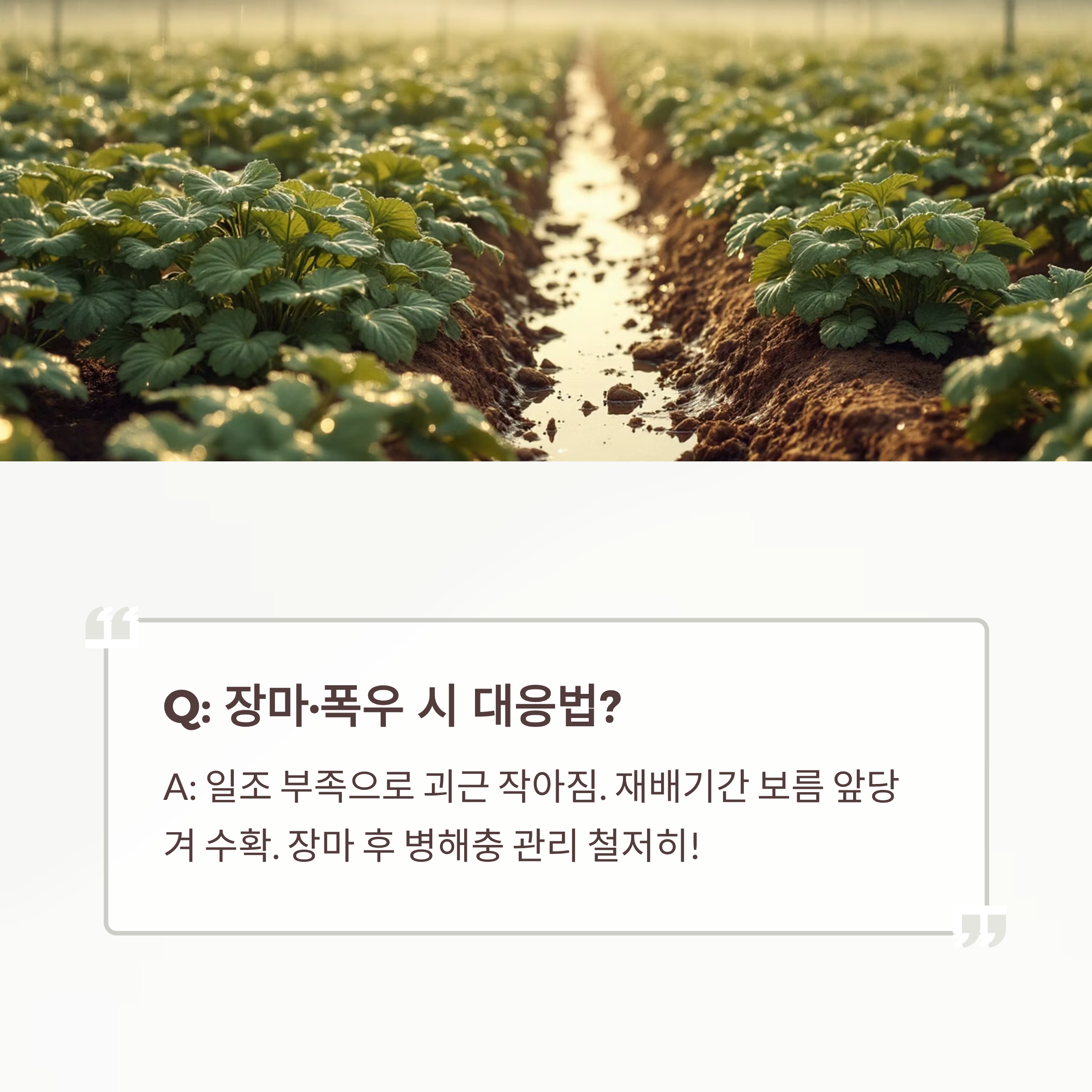 A: 폭우로 일조 부족하면 괴근이 작아지므로 재배기간을 보름 정도 앞당겨 수확하는 게 좋아요. 장마 후엔 병해충 관리도 철저히!