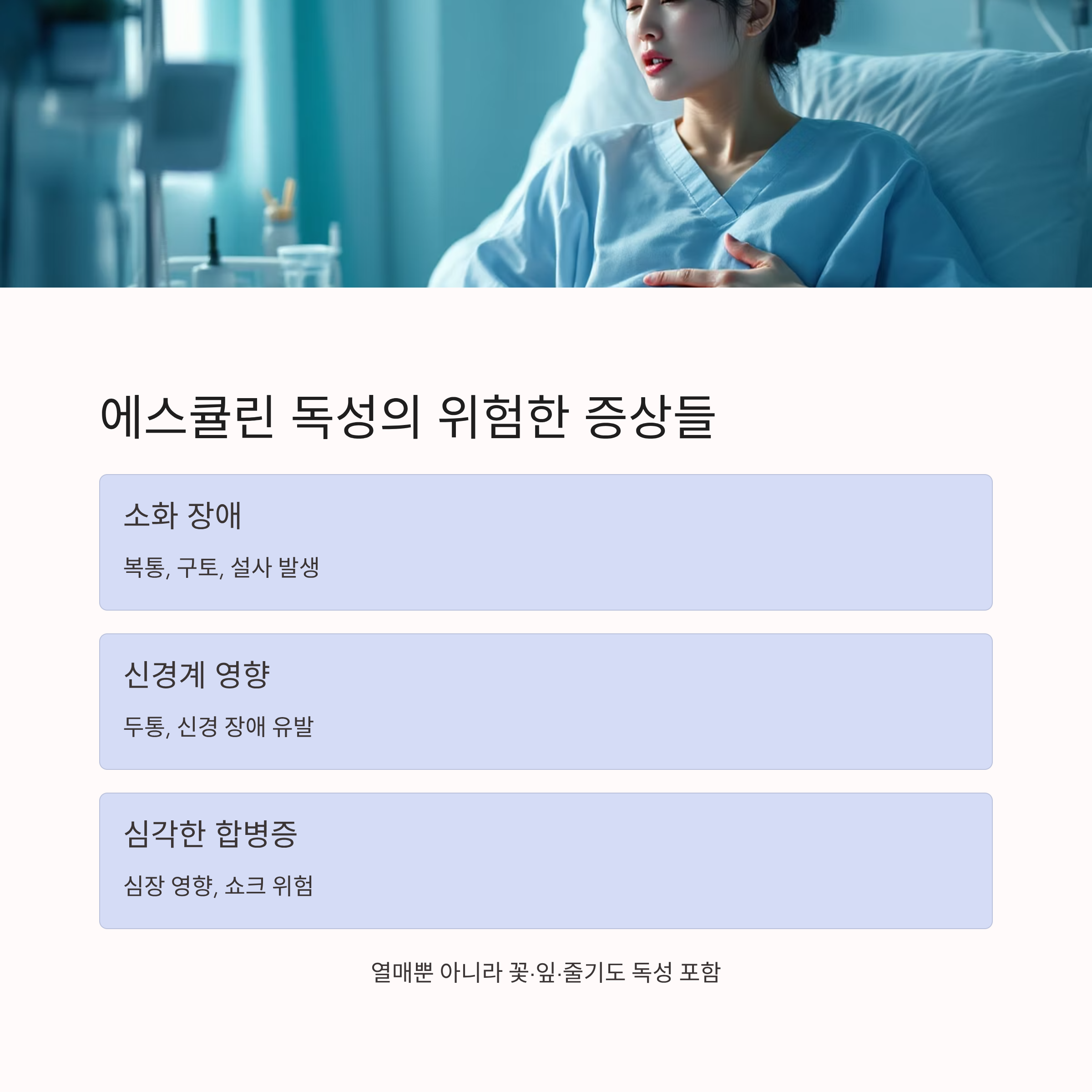 A1. 에스큘린 및 사포닌 등 독성분이 그대로 남아 있어, 복통·구토·두통·설사·신경 및 심장 장애까지 위험할 수 있습니다. 절대 드시면 안 됩니다