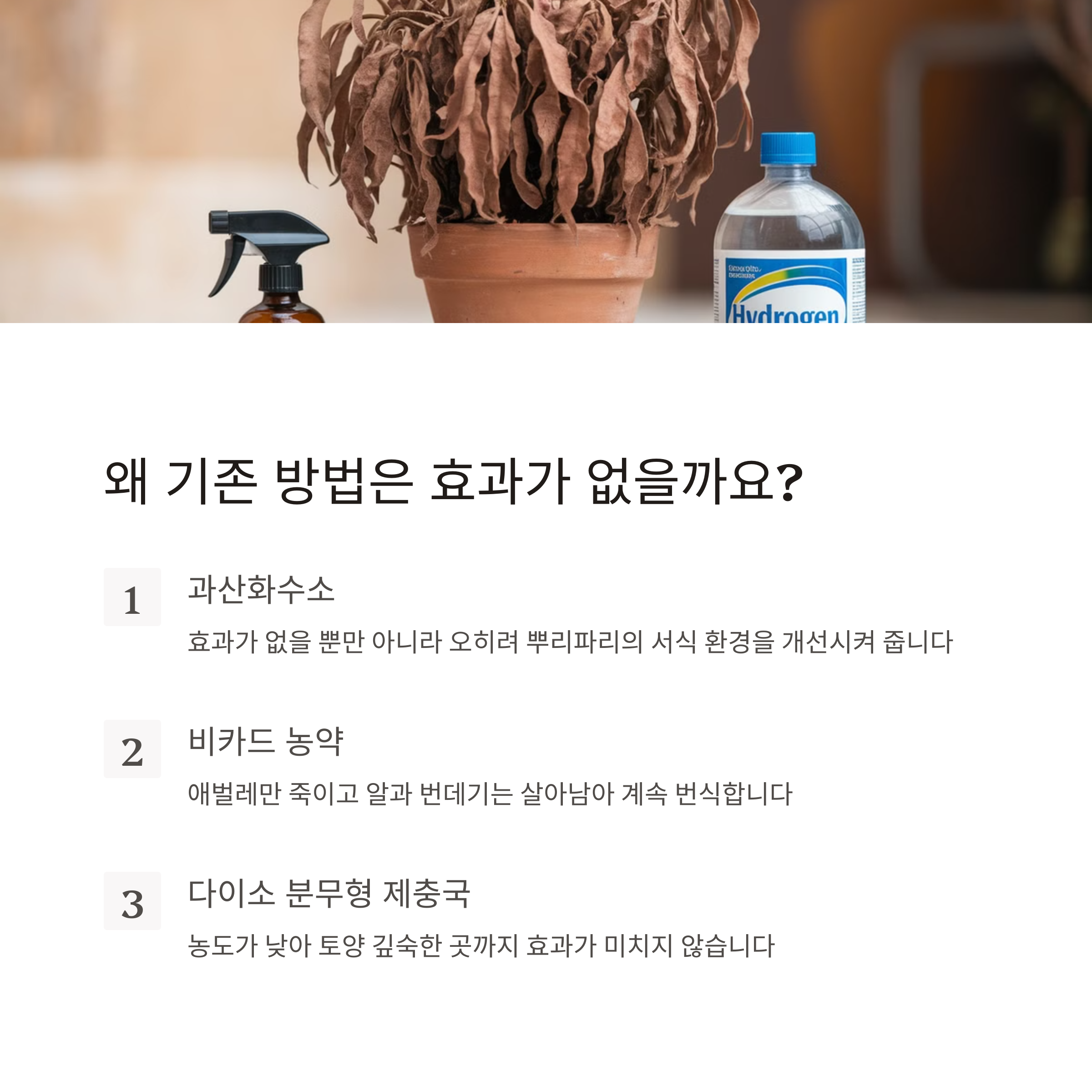 - 과산화수소: 전혀 효과가 없음, 오히려 서식 환경 개선