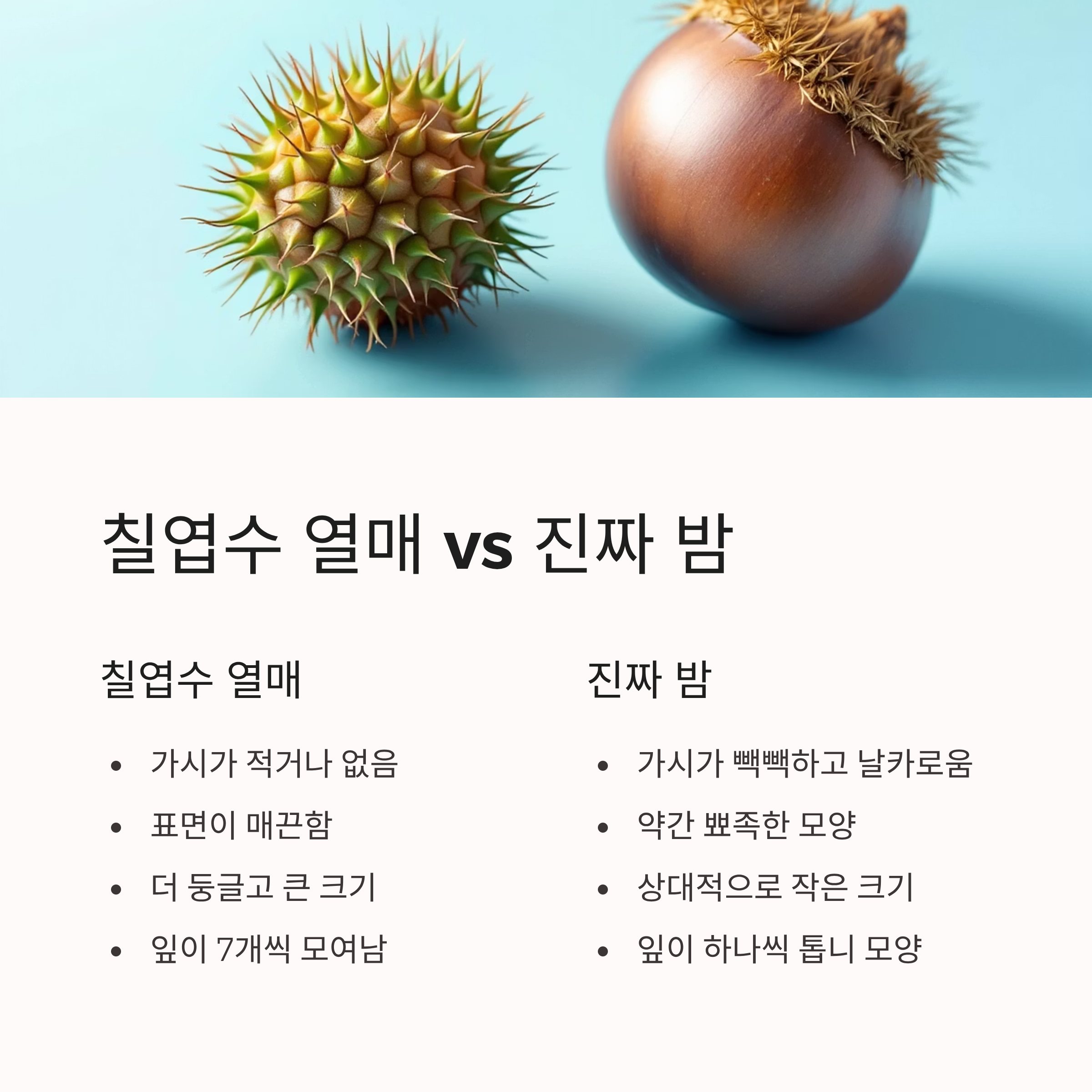- **모양**: 칠엽수는 더 둥글고 밤은 약간 뾰족함